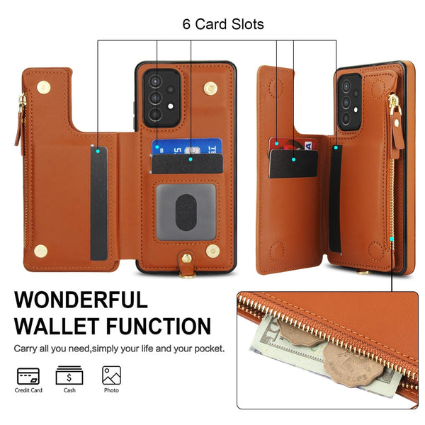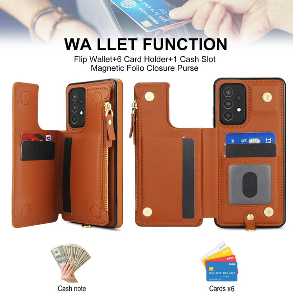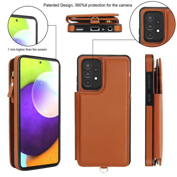 For Samsung Galaxy A52 5G Double Flap Zipper RFID Leather Phone Case with Short Lanyard(Brown)