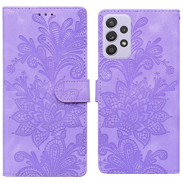 For Samsung Galaxy A52 / A52s 5G Lace Floral Embossed Magnetic Buckle PU Phone Case With Wrist Strap(Purple)