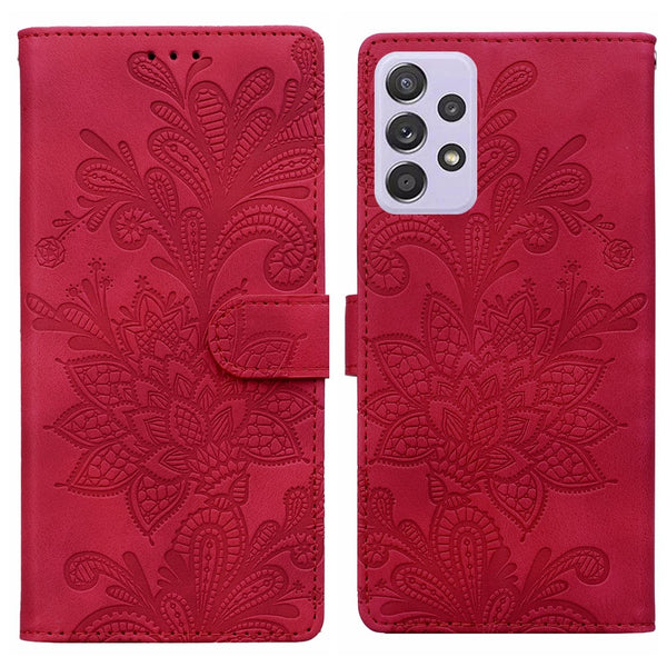 For Samsung Galaxy A53 5G Lace Floral Embossed Magnetic Buckle PU Phone Case With Wrist Strap(Red)