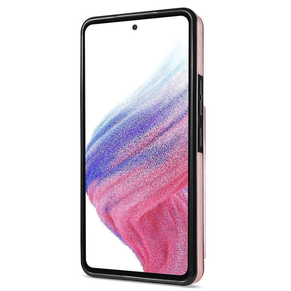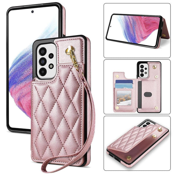 For Samsung Galaxy A53 5G Rhombic Dual Buckle Card Slots Phone Case with Lanyard(Rose Gold)