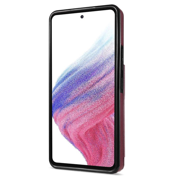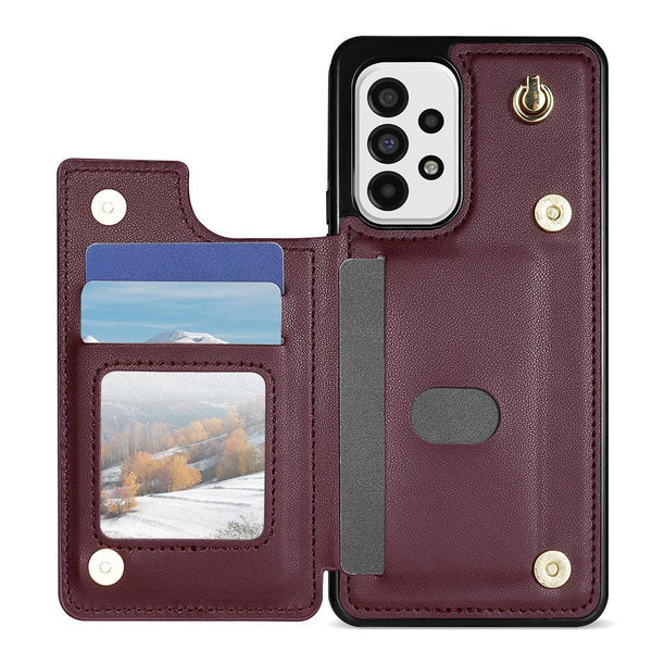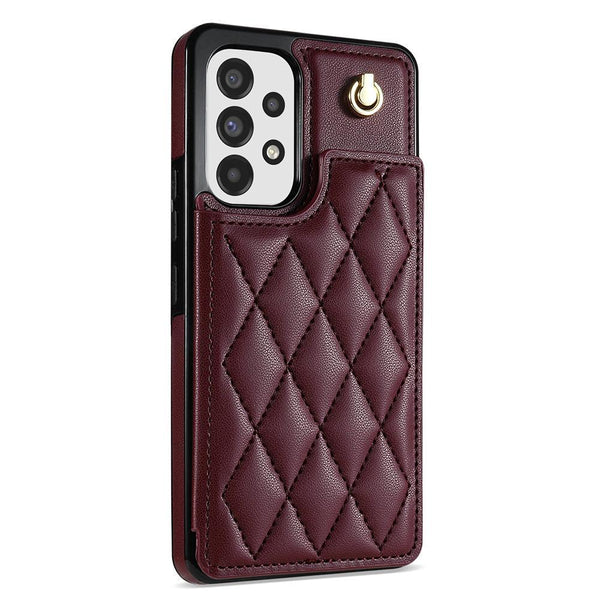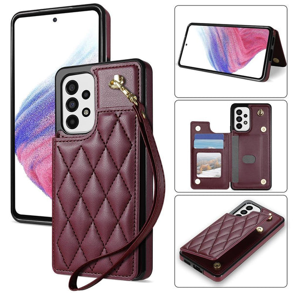 For Samsung Galaxy A53 5G Rhombic Dual Buckle Card Slots Phone Case with Lanyard(Wine Red)