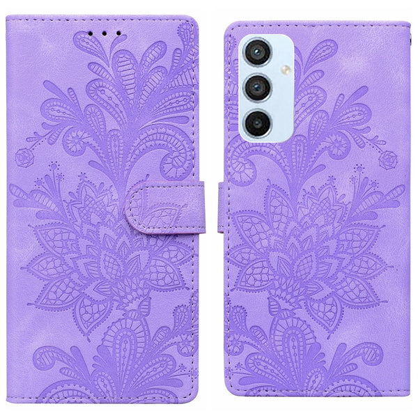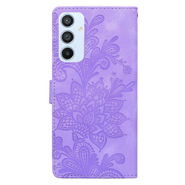 For Samsung Galaxy A54 5G Lace Floral Embossed Magnetic Buckle PU Phone Case With Wrist Strap(Purple)