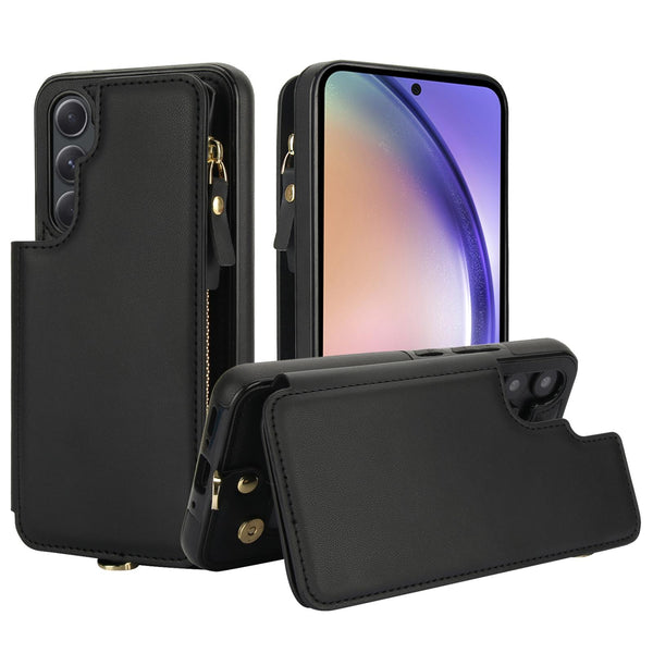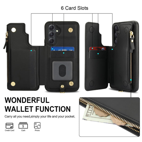 For Samsung Galaxy A54 Double Flap Zipper RFID Leather Phone Case with Short Lanyard(Black)