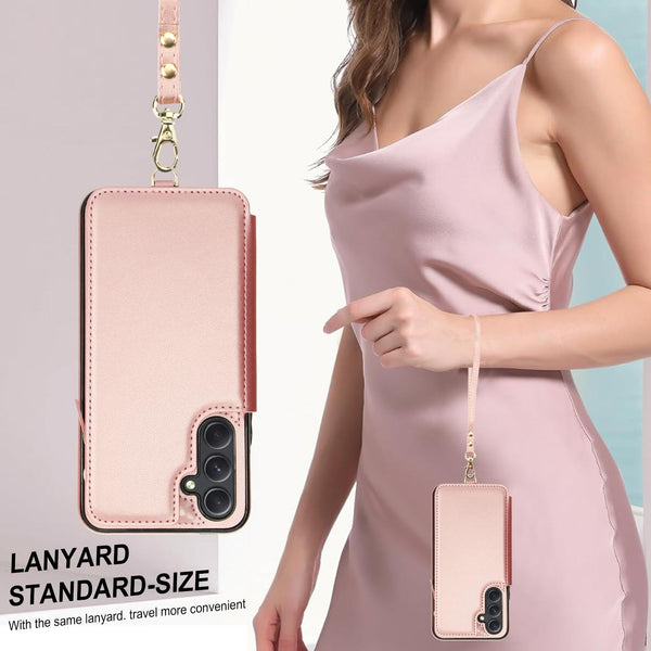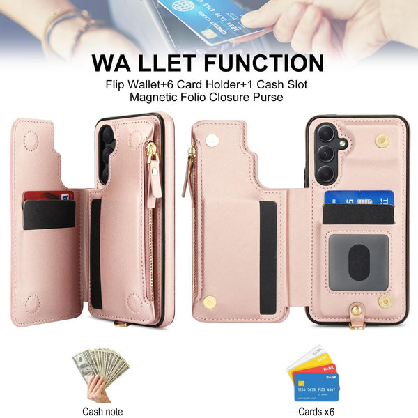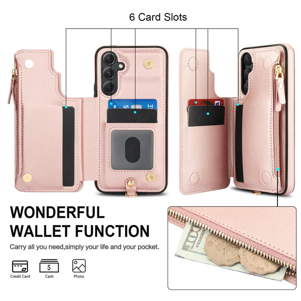For Samsung Galaxy A54 Double Flap Zipper RFID Leather Phone Case with Short Lanyard(Rose Gold)