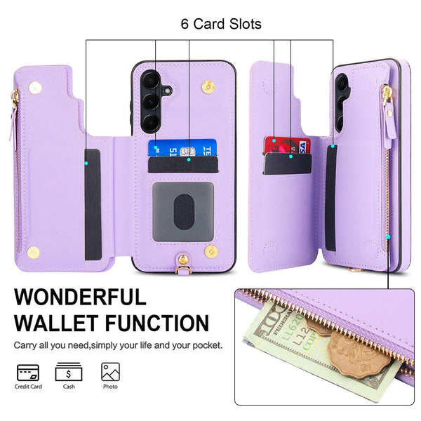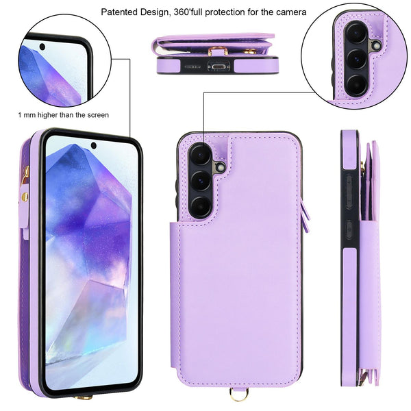 For Samsung Galaxy A55 5G Double Flap Zipper RFID Leather Phone Case with Short Lanyard(Light Purple)