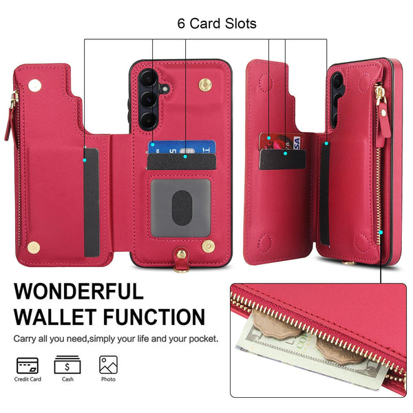 For Samsung Galaxy A55 5G Double Flap Zipper RFID Leather Phone Case with Short Lanyard(Red)
