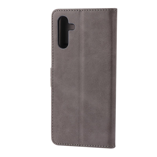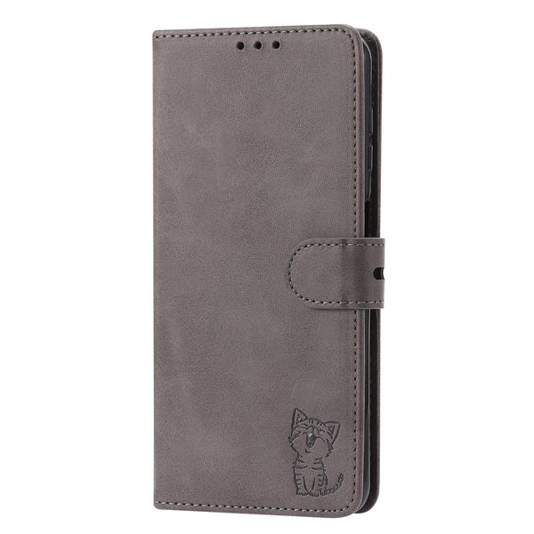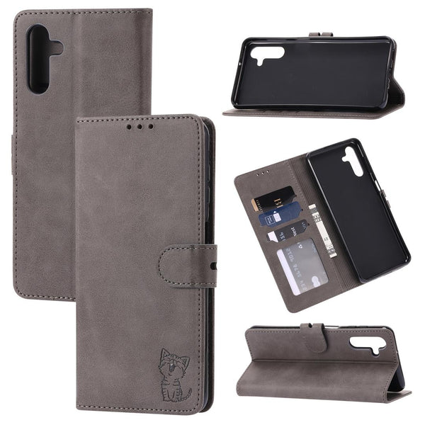 For Samsung Galaxy A56 5G Embossed Happy Cat Pattern Flip Leather Phone Case(Grey)