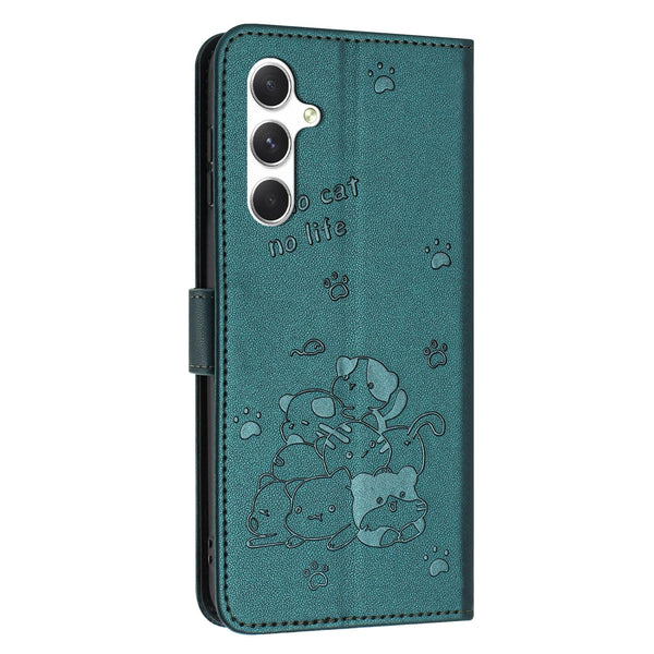 For Samsung Galaxy A56 5G Embossed Kitten Phone Leather Case with Lanyard(Dark Green)
