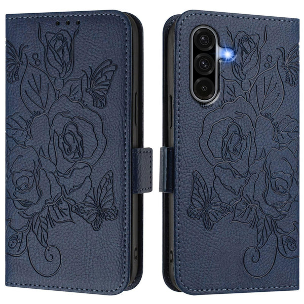For Samsung Galaxy A56 5G Embossed Rose RFID Anti-theft Leather Phone Case(Dark Blue)