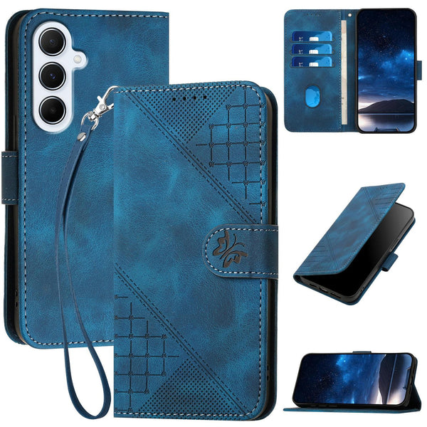 For Samsung Galaxy A56 5G Grid Butterfly Embossed Pattern Leather Phone Case with Lanyard(Dark Blue)