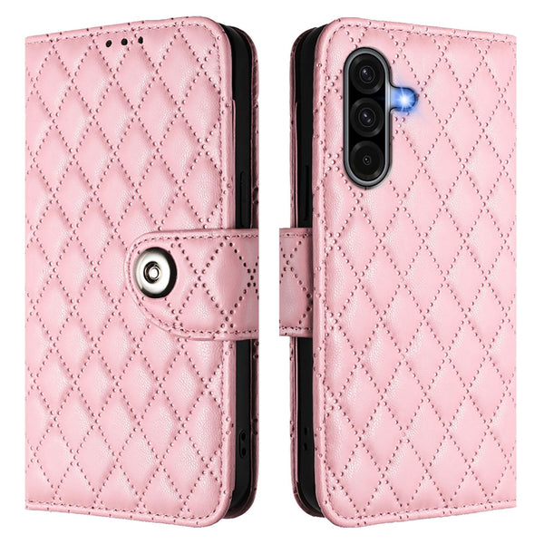 For Samsung Galaxy A56 5G Rhombic Texture Flip Leather Phone Case with Lanyard(Pink)