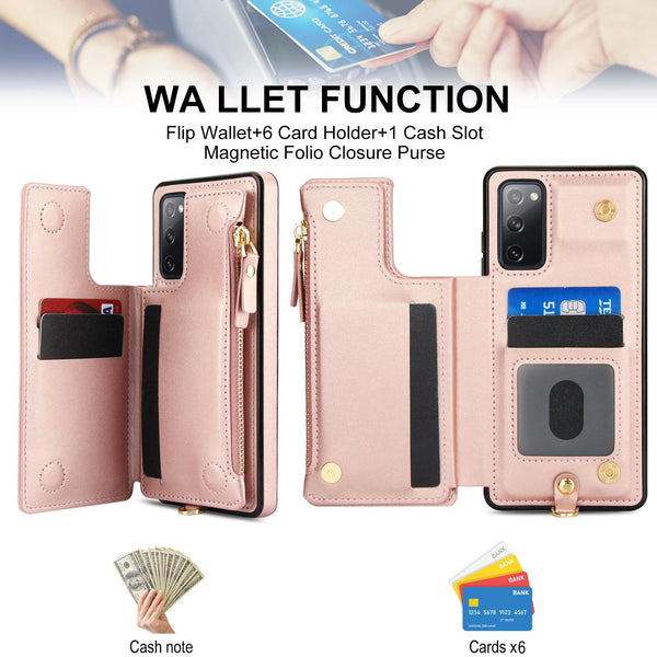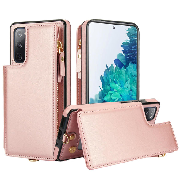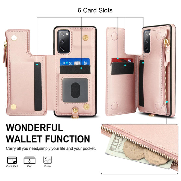 For Samsung Galaxy S20 FE Double Flap Zipper RFID Leather Phone Case with Short Lanyard(Rose Gold)