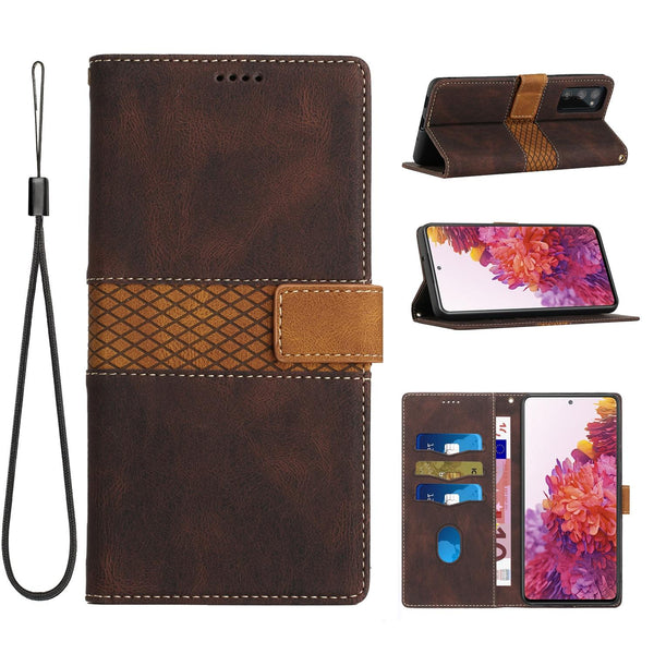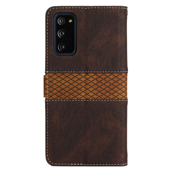 For Samsung Galaxy S20 FE Grid Stitching Leather Phone Case with Lanyard(Brown)