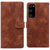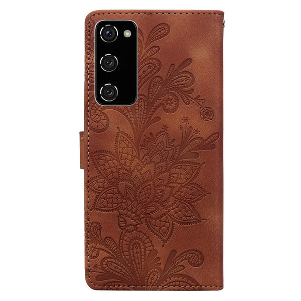 For Samsung Galaxy S20 FE Lace Floral Embossed Magnetic Buckle PU Phone Case With Wrist Strap(Brown)