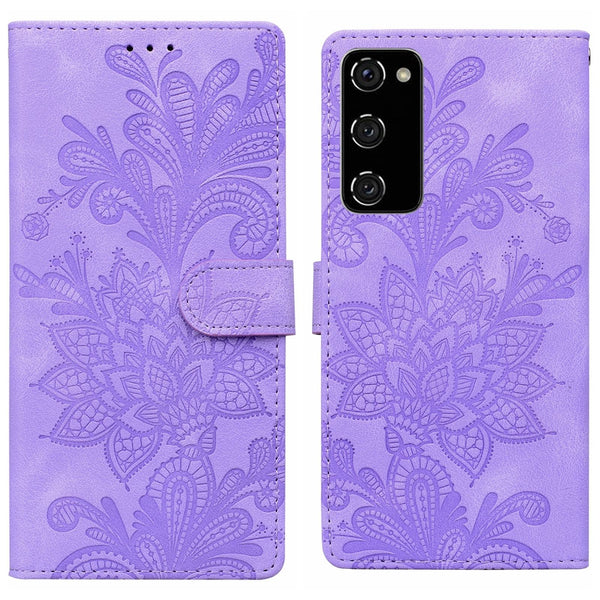 For Samsung Galaxy S20 FE Lace Floral Embossed Magnetic Buckle PU Phone Case With Wrist Strap(Purple)
