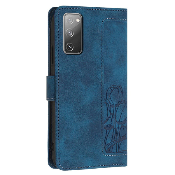 For Samsung Galaxy S20 FE Tulips Embossed Leather Phone Case with Lanyard(Blue)