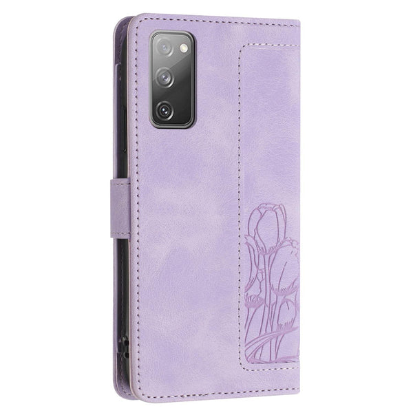 For Samsung Galaxy S20 FE Tulips Embossed Leather Phone Case with Lanyard(Purple)