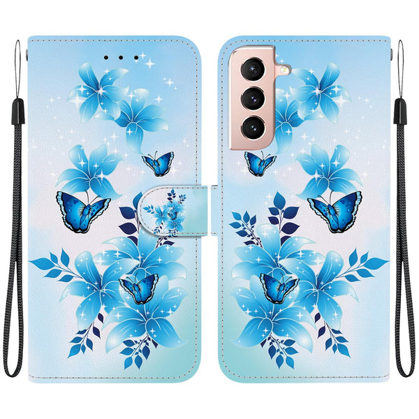 For Samsung Galaxy S21 5G Crystal Texture Colored Drawing Leather Phone Case(Blue Butterflies)