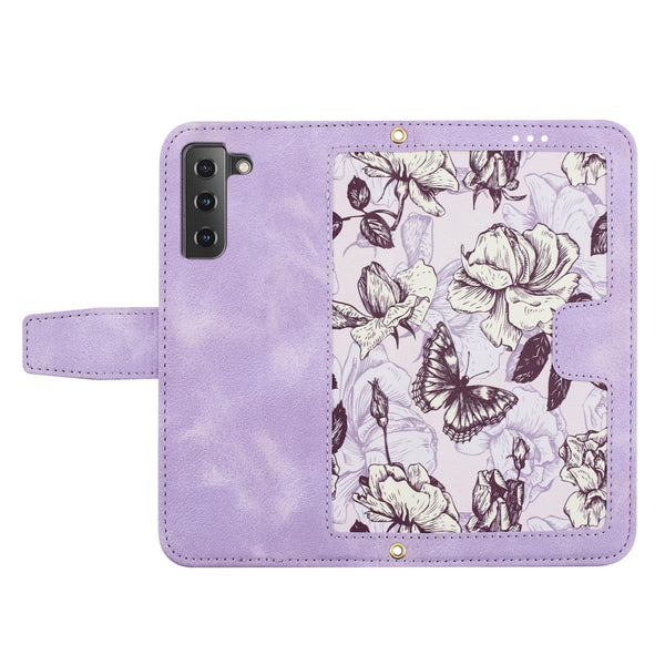 For Samsung Galaxy S21+ 5G Floral Pattern Leather Phone Case with Lanyard(Light Purple)