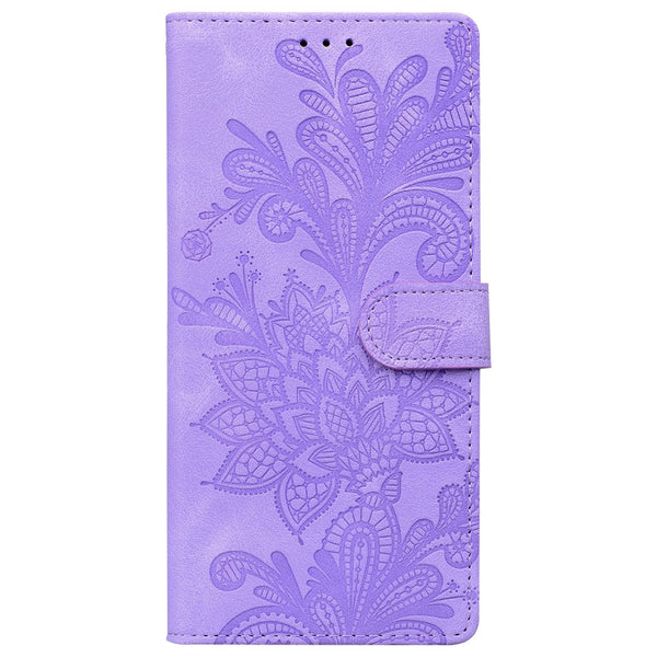 For Samsung Galaxy S21+ 5G Lace Floral Embossed Magnetic Buckle PU Phone Case With Wrist Strap(Purple)