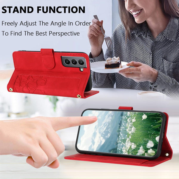 For Samsung Galaxy S21+ 5G Tulips Embossed Leather Phone Case with Lanyard(Red)