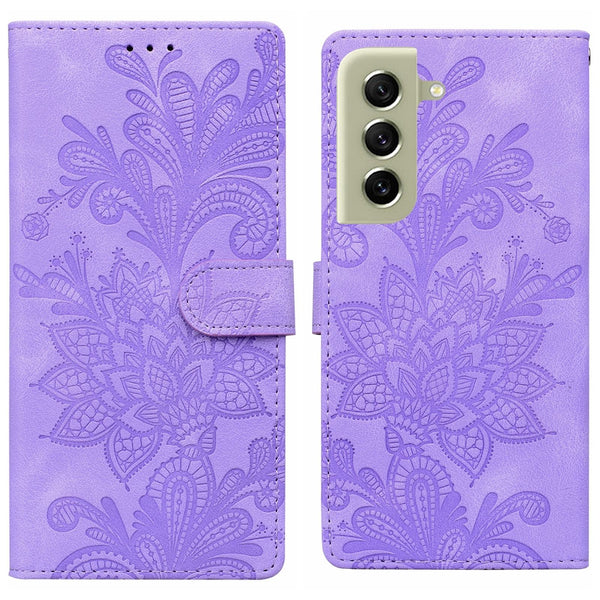 For Samsung Galaxy S21 FE 5G Lace Floral Embossed Magnetic Buckle PU Phone Case With Wrist Strap(Purple)