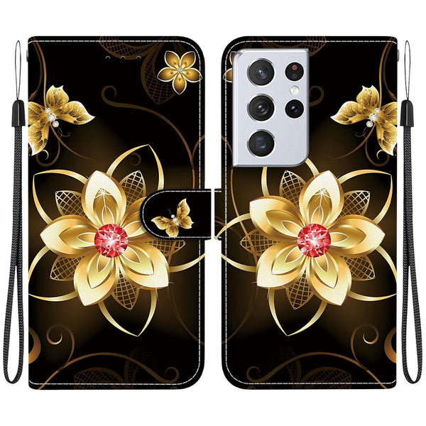 For Samsung Galaxy S21 Ultra 5G Crystal Texture Colored Drawing Leather Phone Case(Gold Flower)