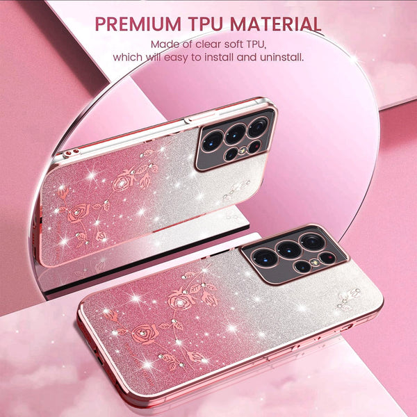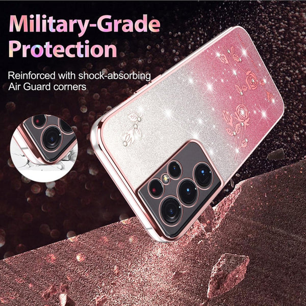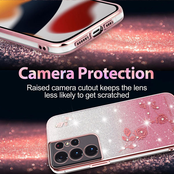 For Samsung Galaxy S21 Ultra 5G Gradient Glitter Flower All-inclusive Phone Case(Pink)