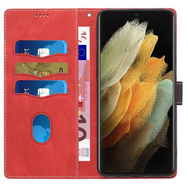 For Samsung Galaxy S21 Ultra 5G Grid Stitching Leather Phone Case with Lanyard(Red)