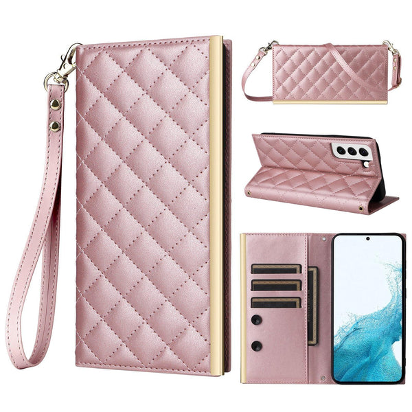 For Samsung Galaxy S22 5G Crossbody Rhombic Sucker Leather Phone Case(Rose Gold)