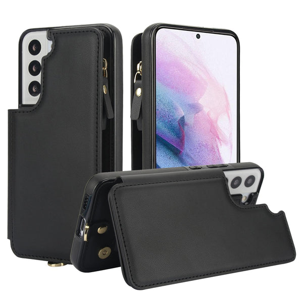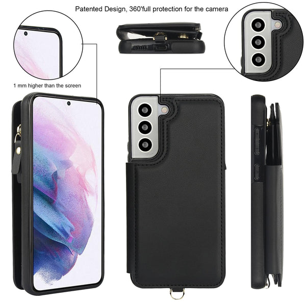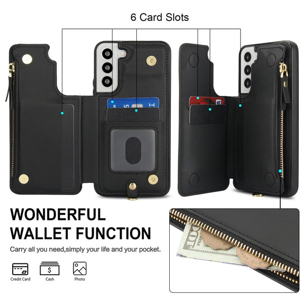 For Samsung Galaxy S22 5G Double Flap Zipper RFID Leather Phone Case with Short Lanyard(Black)