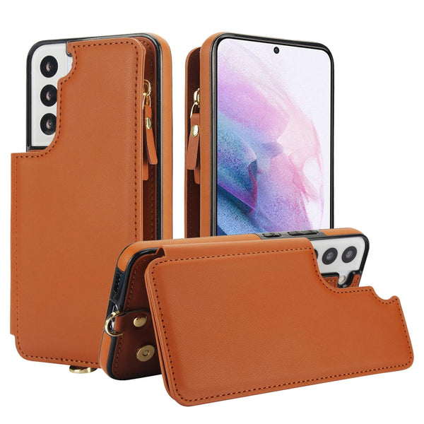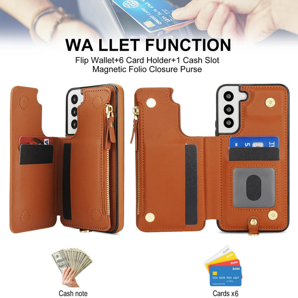 For Samsung Galaxy S22 5G Double Flap Zipper RFID Leather Phone Case with Short Lanyard(Brown)