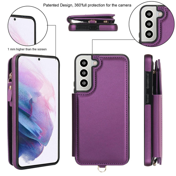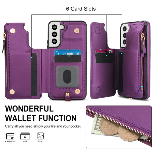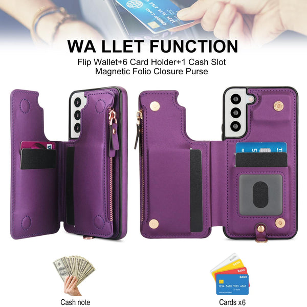For Samsung Galaxy S22 5G Double Flap Zipper RFID Leather Phone Case with Short Lanyard(Dark Purple)