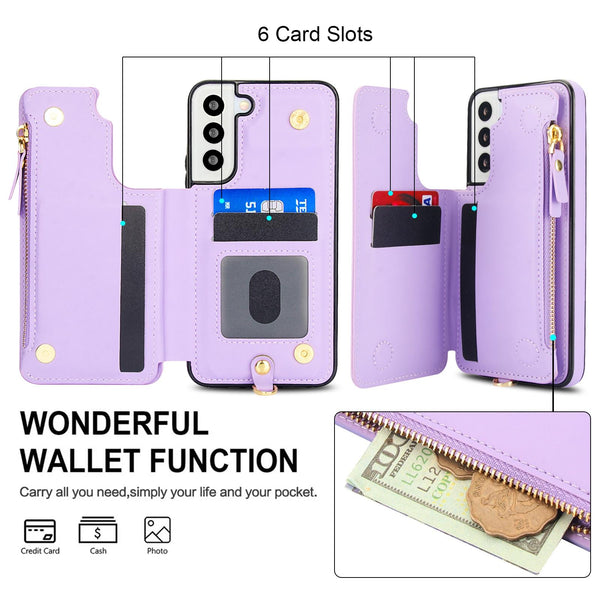 For Samsung Galaxy S22 5G Double Flap Zipper RFID Leather Phone Case with Short Lanyard(Light Purple)
