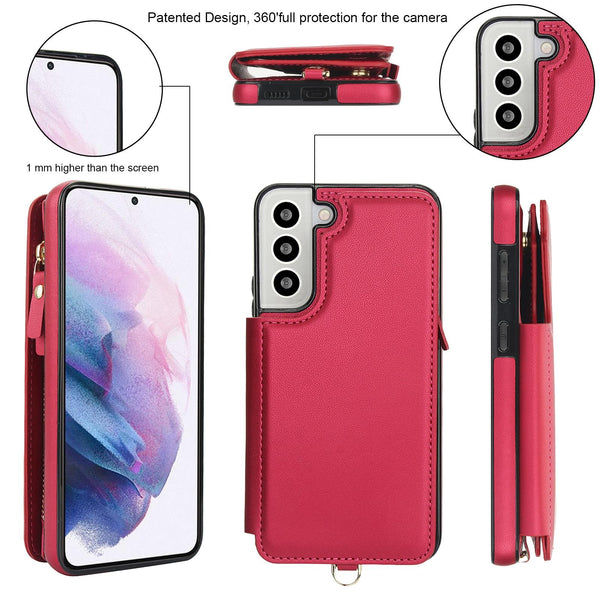 For Samsung Galaxy S22 5G Double Flap Zipper RFID Leather Phone Case with Short Lanyard(Red)