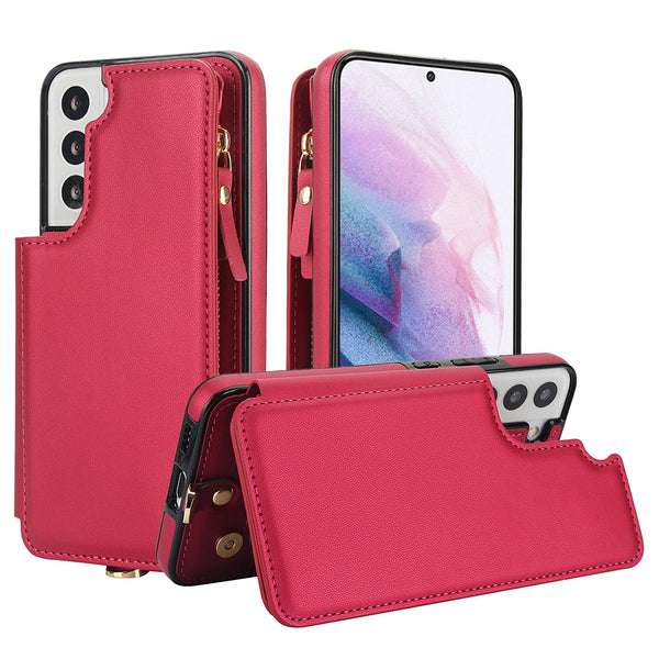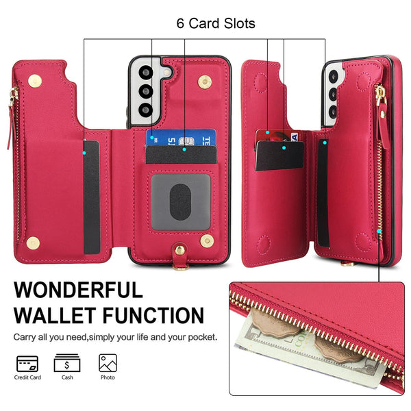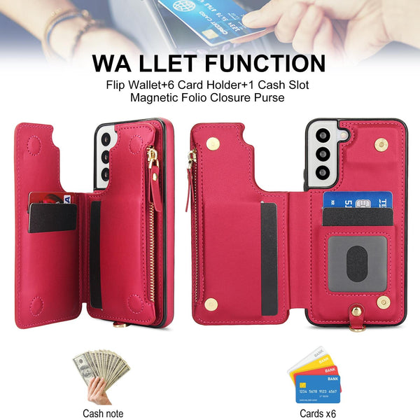 For Samsung Galaxy S22+ 5G Double Flap Zipper RFID Leather Phone Case with Short Lanyard(Red)