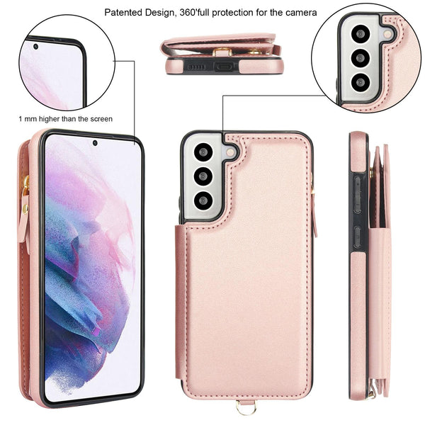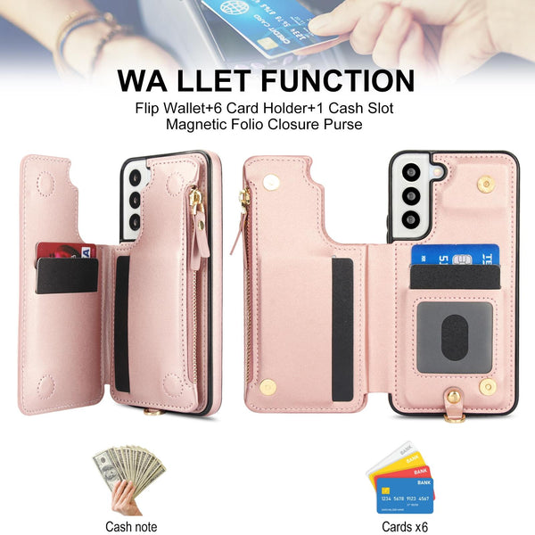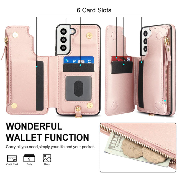 For Samsung Galaxy S22 5G Double Flap Zipper RFID Leather Phone Case with Short Lanyard(Rose Gold)