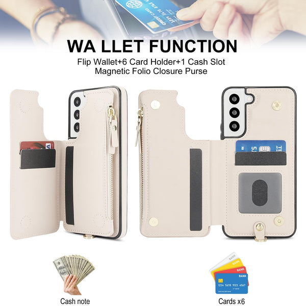 For Samsung Galaxy S22+ 5G Double Flap Zipper RFID Leather Phone Case with Short Lanyard(White)
