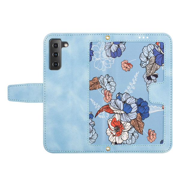 For Samsung Galaxy S22+ 5G Floral Pattern Leather Phone Case with Lanyard(Light Blue)
