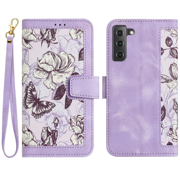 For Samsung Galaxy S22+ 5G Floral Pattern Leather Phone Case with Lanyard(Light Purple)