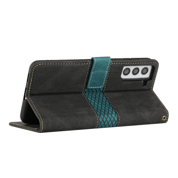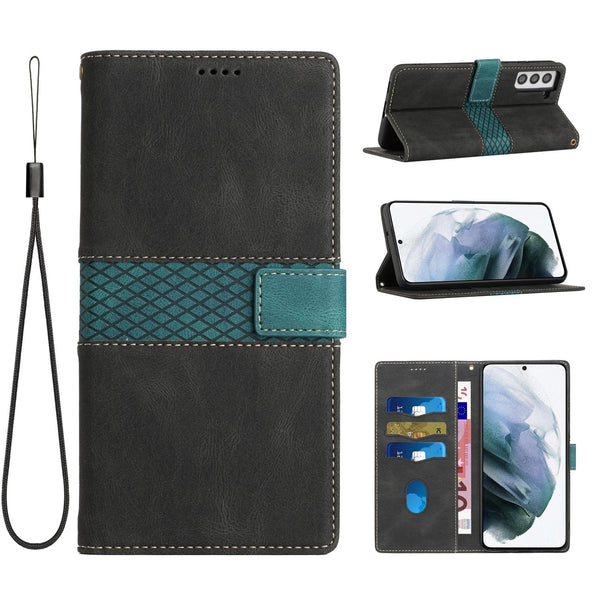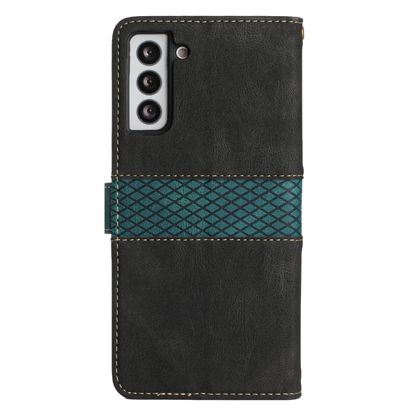 For Samsung Galaxy S22+ 5G Grid Stitching Leather Phone Case with Lanyard(Black)