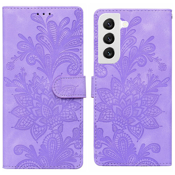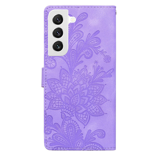 For Samsung Galaxy S22 5G Lace Floral Embossed Magnetic Buckle PU Phone Case With Wrist Strap(Purple)
