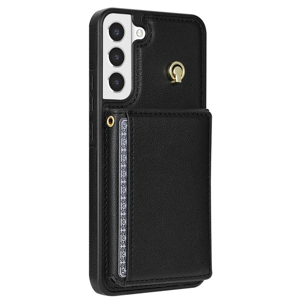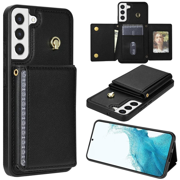 For Samsung Galaxy S22 5G Three Fold Card Bag Phone Case with Long Lanyard(Black)