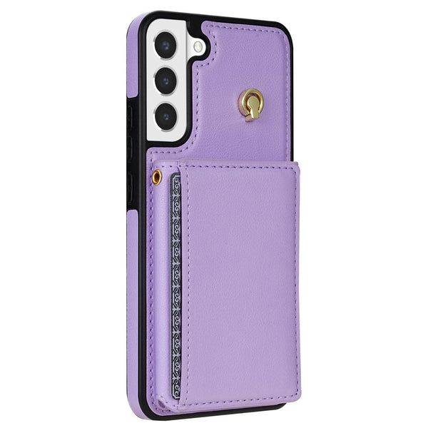 For Samsung Galaxy S22 5G Three Fold Card Bag Phone Case with Long Lanyard(Purple)
