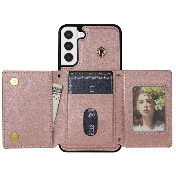 For Samsung Galaxy S22+ 5G Three Fold Card Bag Phone Case with Long Lanyard(Rose Gold)