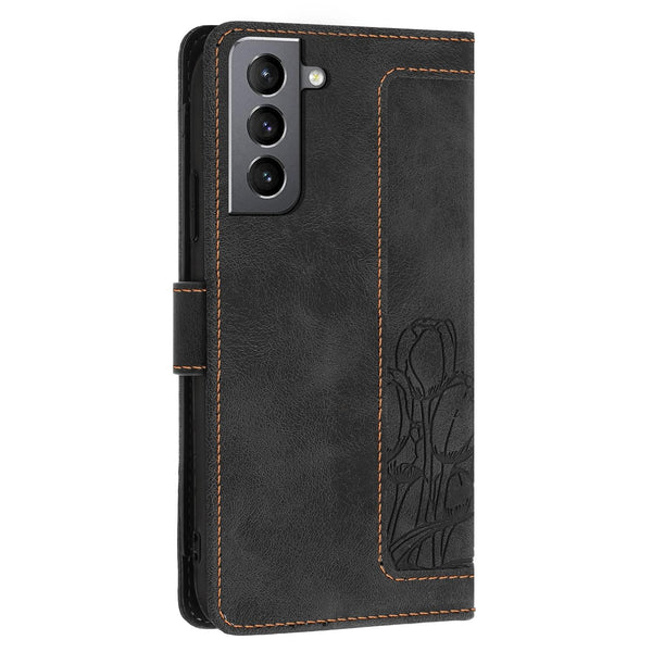 For Samsung Galaxy S22 5G Tulips Embossed Leather Phone Case with Lanyard(Black)