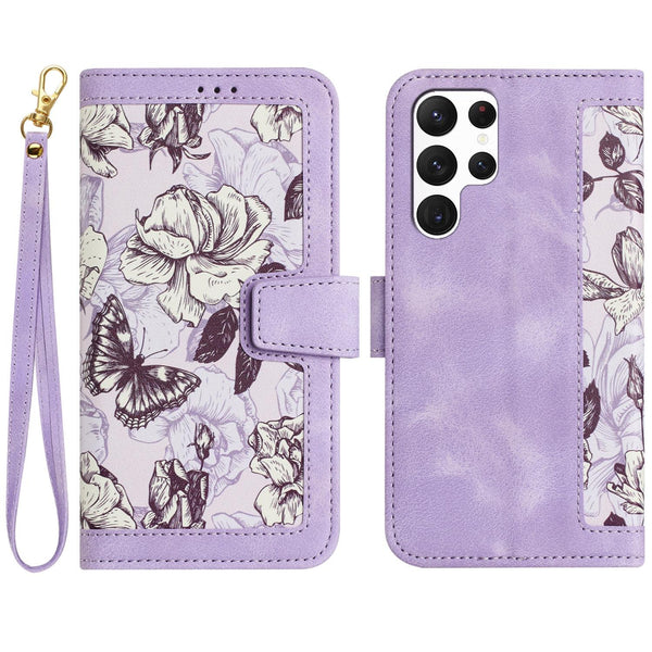 For Samsung Galaxy S22 Ultra 5G Floral Pattern Leather Phone Case with Lanyard(Light Purple)