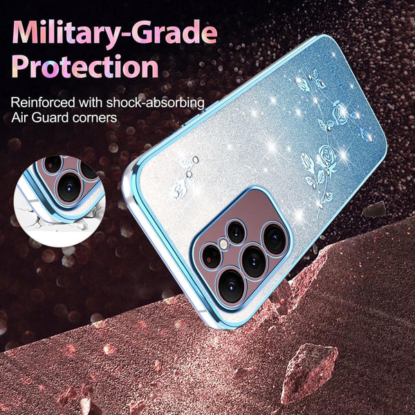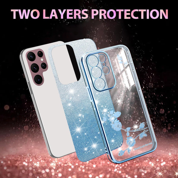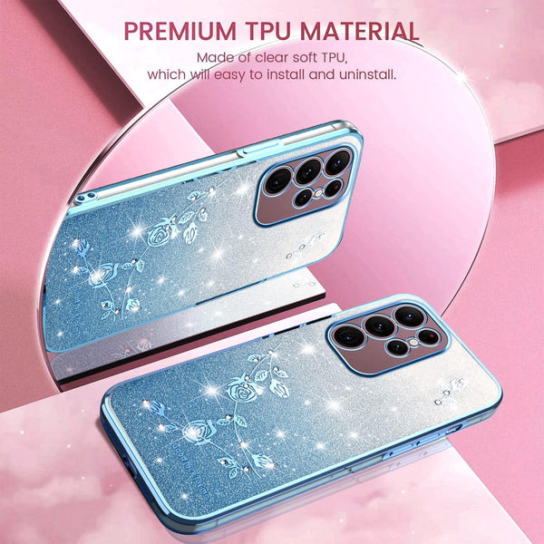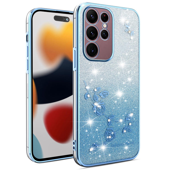For Samsung Galaxy S22 Ultra 5G Gradient Glitter Flower All-inclusive Phone Case(Blue)