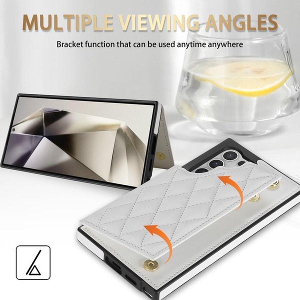 For Samsung Galaxy S22 Ultra 5G Rhombic Dual Buckle Card Slots Phone Case with Lanyard(White)