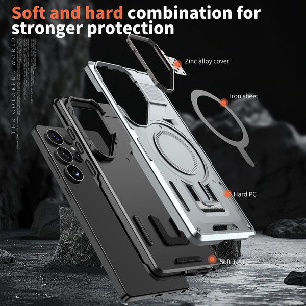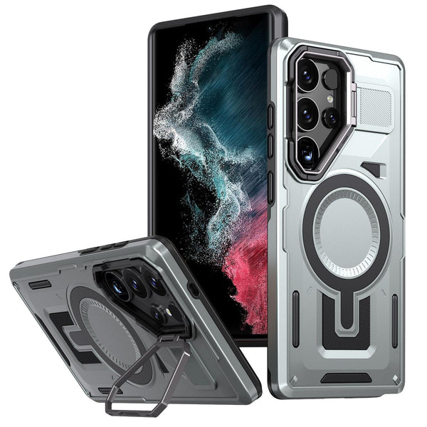 For Samsung Galaxy S22 Ultra 5G Shield Hollow Frame Holder MagSafe Phone Case(Grey)